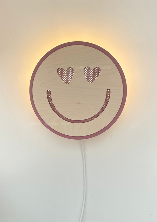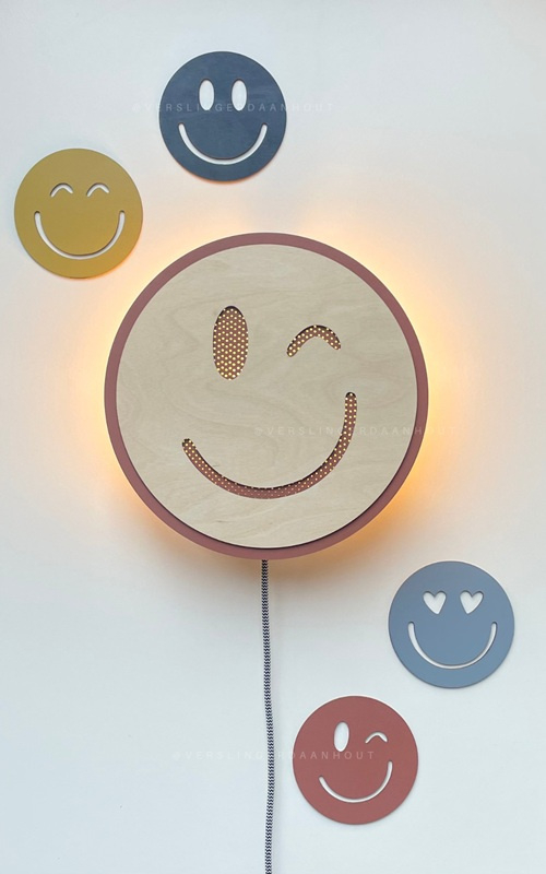 Wie is er nou niet dol op smiley's! Een leuke smiley lamp vrolijkt toch iedere kamer op :). Er is keuze uit 6 verschillende smiley's, want ja iedereen vindt wat anders leuk en wij konden niet kiezen! De lamp is gemaakt van 6 mm berkenhout voor de onderlaag, met een 3 mm berkenhout voor de bovenlaag waar het smiley gezichtje is uitgesneden. In de onderste laag zitten op de plek waar het smiley gezichtje zit gaatjes gemaakt waardoor het licht mooi doorheen schijnt. Beide lagen kunnen in kleur naar keuze worden gemaakt.